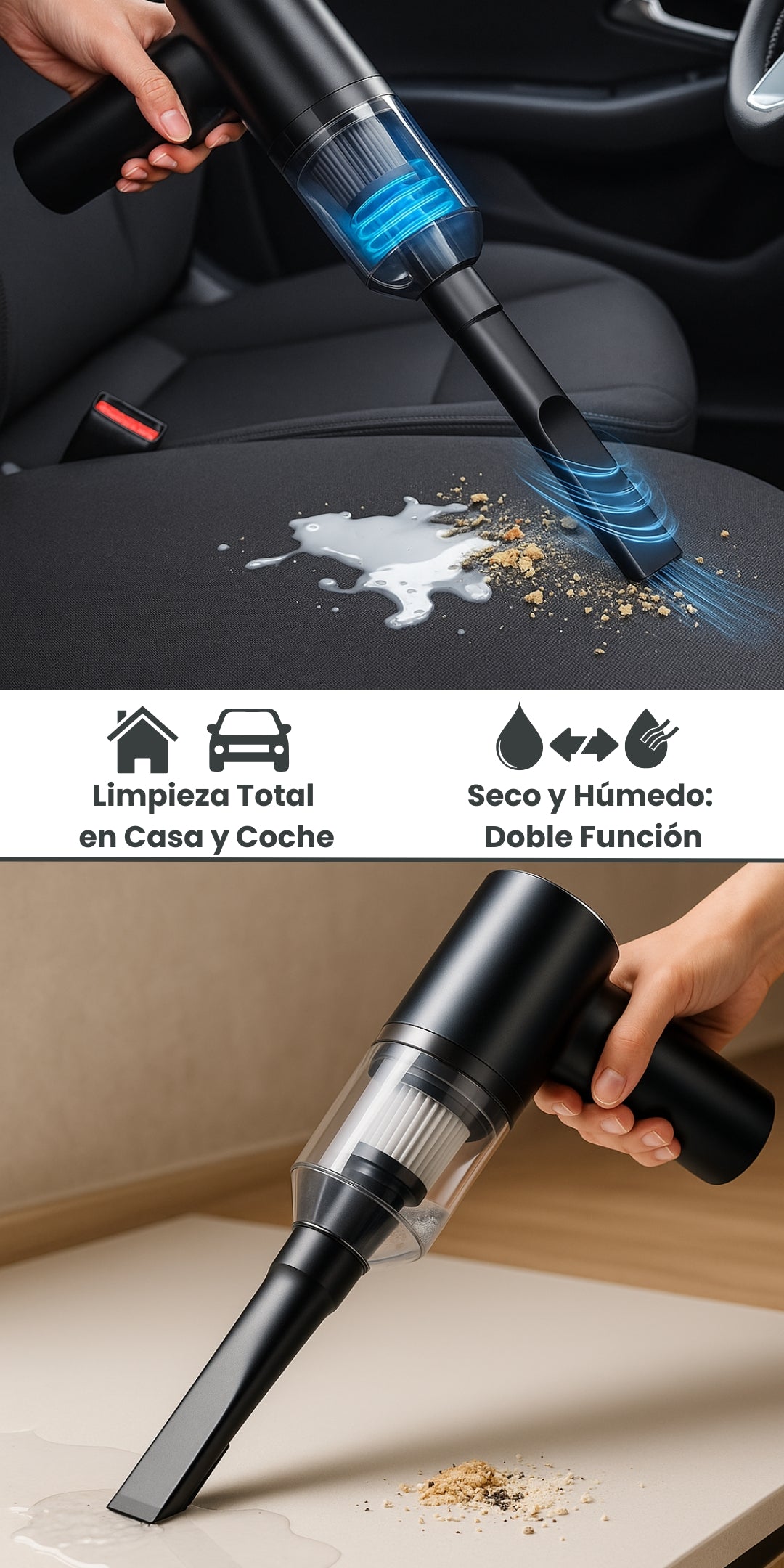 - Doble uso hogar y coche: limpia migas, polvo y suciedad tanto en casa como en el automóvil con un solo dispositivo.