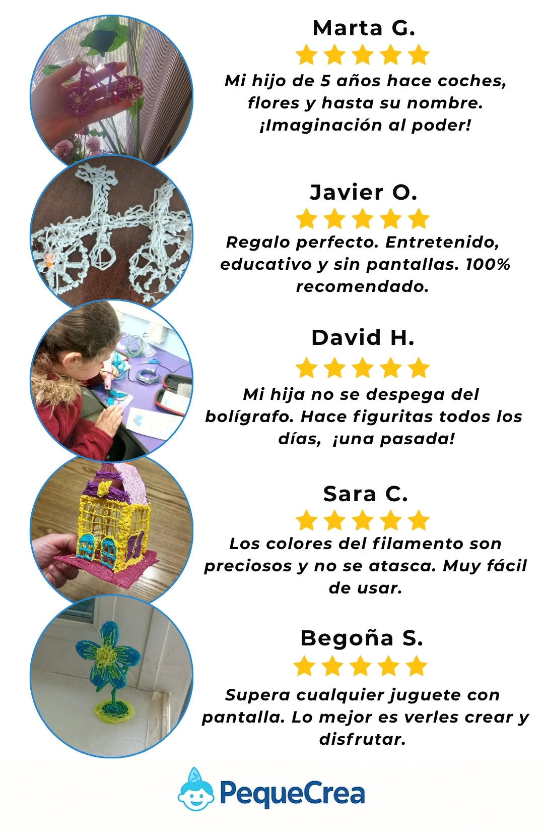 Uso con supervisión. No tocar la boquilla caliente y trabajar sobre una superficie estable. Materiales compatibles y controles de calidad PequeCrea.